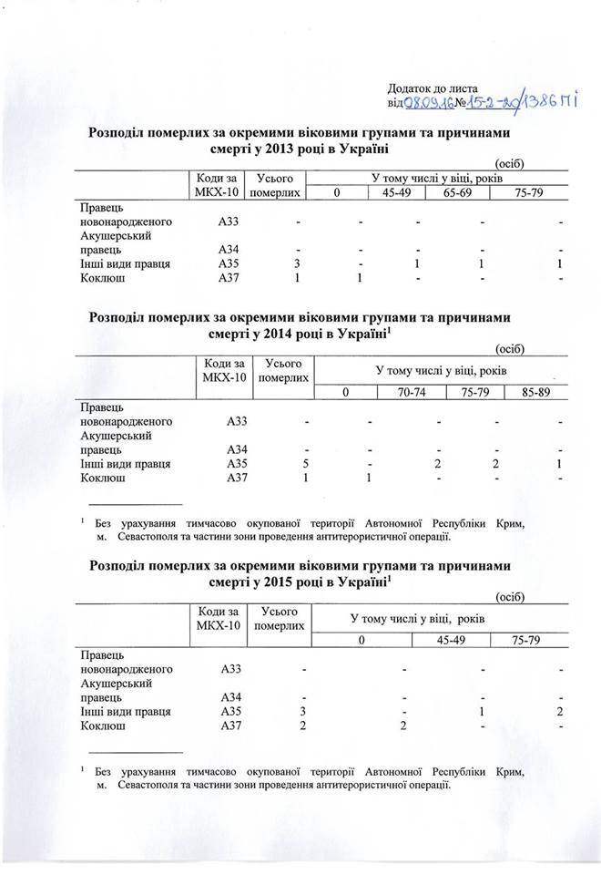 1) від правця в Україні за три роки 2013-2014-2015 НЕ померло ЖОДНОЇ дитини.