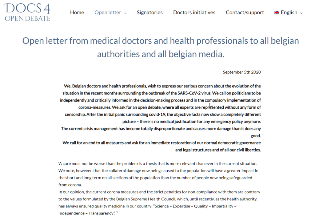 “Ми, бельгійські лікарі та медичні працівники, хочемо висловити свою серйозну стурбованість розвитком ситуації за останні місяці навколо спалаху вірусу SARS-CoV-2. Ми закликаємо політиків бути незалежними та критично поінформованими у процесі прийняття рішень та застосуванні примусових корона-заходів.