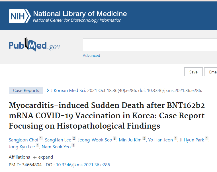 “Спричинена міокардитом раптова смерть після вакцинації проти COVID-19 мРНК-вакциною BNT162b2 (Pfizer – Перекл.) в Кореї: звіт про випадок зосереджений на гістопатологічних результатах.”