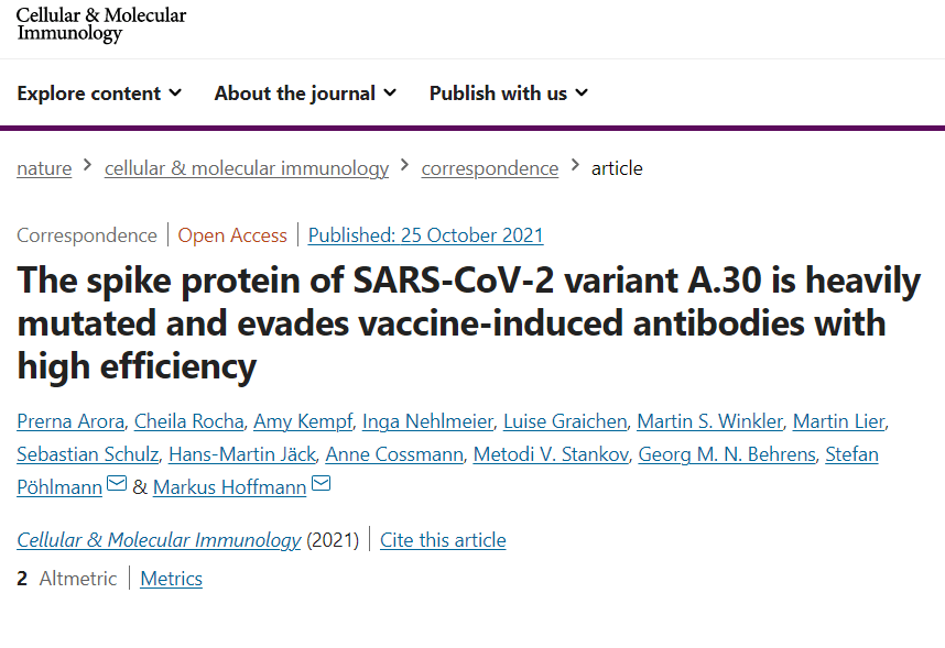 публікація “Спайк-білок штаму A.30 SARS-CoV-2 сильно мутований і з високою ефективністю ухиляється від індукованих вакциною антитіл”