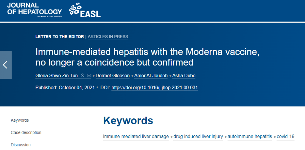 Ми з цікавістю прочитали останні випадки, що свідчать про можливість імуно-опосередкованого гепатиту, викликаного вакцинами Pfizer-BioNTech та Moderna mRNA-1273 проти вірусу SARS-CoV-2. Однак, оскільки когорта вакцинованих проти COVID-19 збільшується, раніше зареєстровані випадки не могли виключити випадковий розвиток аутоімунного гепатиту, захворюваність якого становить 3/100 000 населення на рік. Наш випадок демонструє переконливі докази імуноопосередкованого гепатиту, викликаного вакциною, зі швидким початком ураження печінки після першої дози Moderna, яка при повторному впливі (друга доза – Перекл.) призвела до гострого тяжкого аутоімунного гепатиту.